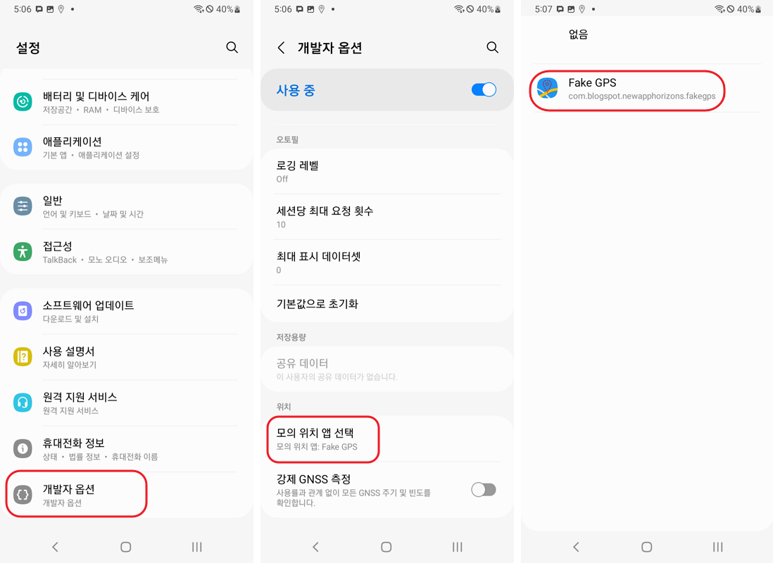 - Fake GPS 앱 선택: 해당 항목을 탭하여, 방금 설치한 Fake GPS 앱을 목록에서 선택해 주세요.