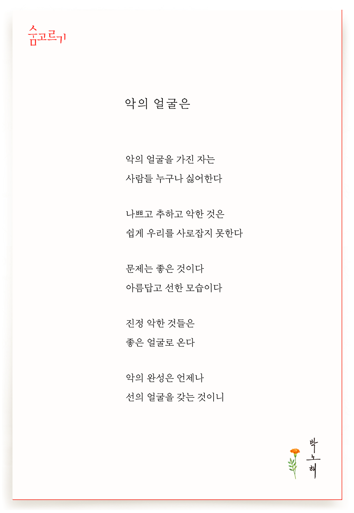 악의 얼굴을 가진 자는/사람들 누구나 싫어한다//나쁘고 추하고 악한 것은/쉽게 우리를 사로잡지 못한다//문제는 좋은 것이다/아름답고 선한 모습이다//진정 악한 것들은/좋은 얼굴로 온다//악의